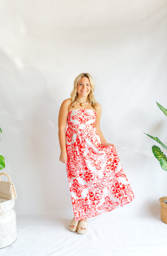 Red Strapless Printed Maxi Dress