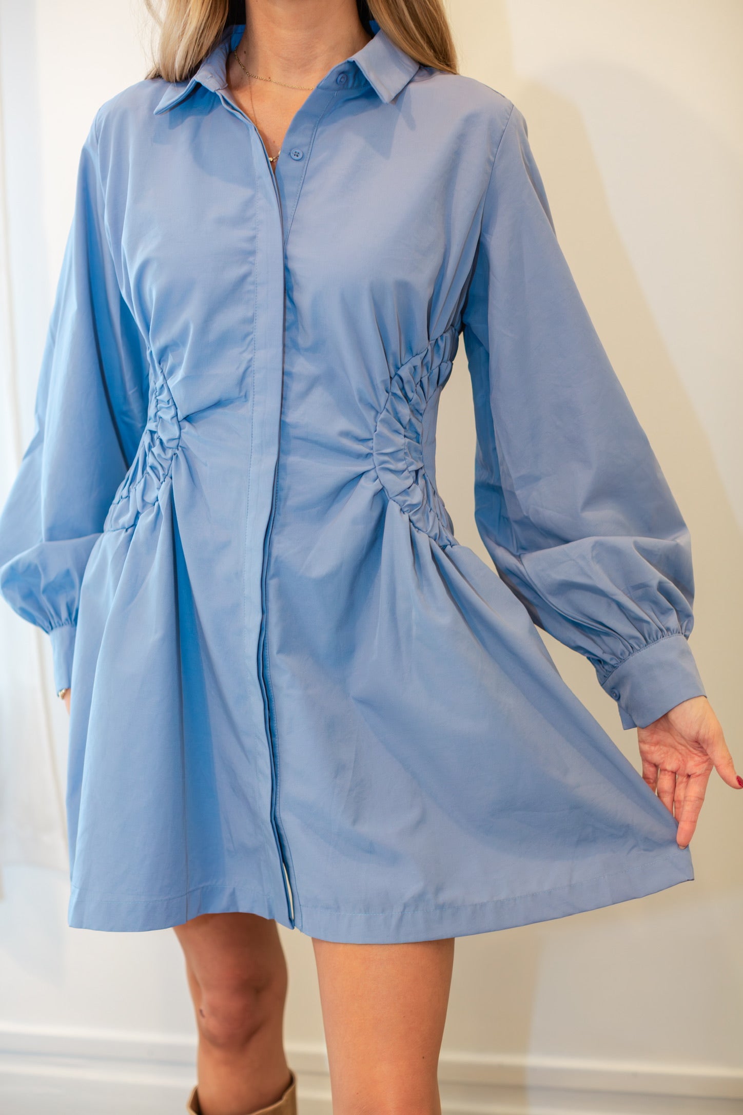 A modern twist on the classic shirt dress. This style features flattering side ruching and voluminous balloon sleeves for added drama. A structured collar and button-down front keep the look polished, while the cinched waist and flared hem create a feminine, stand-out silhouette—perfect for chic daytime styling or dressed-up evenings.